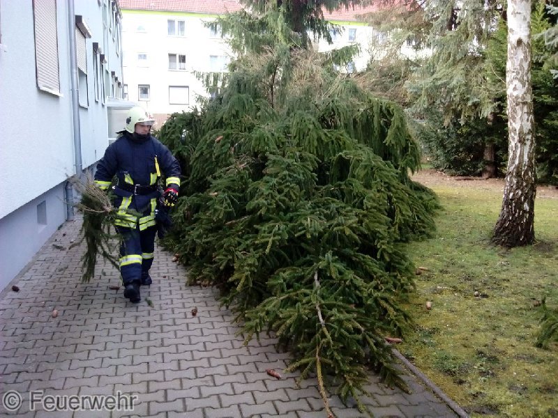 Zum ersten Einsatz beim Sturmtief Niklas wurden wir in den Mittagsstunden gerufen. Umgestürzter Baum vor Wohnblock lautete das Alarmierungsstichwort. Vor Ort lag eine Tanne zum Teil auf einen Gehweg und auf einer Grünfläche. Durch unsere Kräfte wurde der Gehweg wieder freigeräumt und die Einsatzstelle an den Eigentümer übergeben.